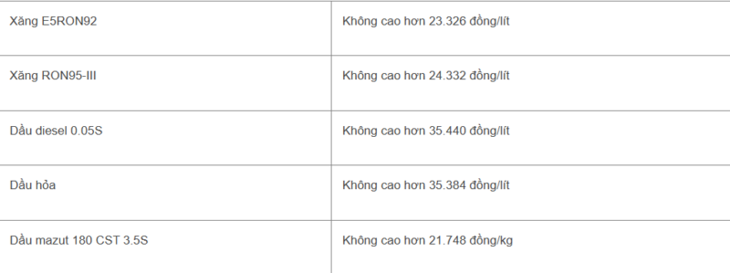 Tại kỳ điều hành đêm 26/3, xăng E5 RON92 không cao hơn 23.326 đồng/lít. Giá xăng RON95 giảm 5.625 đồng/lít, không cao hơn 24.332 đồng/lít. Giá dầu diesel giảm 2.459 đồng/lít, không cao hơn 35.440 đồng/lít. Giá dầu hỏa giảm 971 đồng/lít, không cao hơn 35.384 đồng/lít và giá dầu mazut tăng 1.503 đồng/kg, không cao hơn 21.748 đồng/kg.